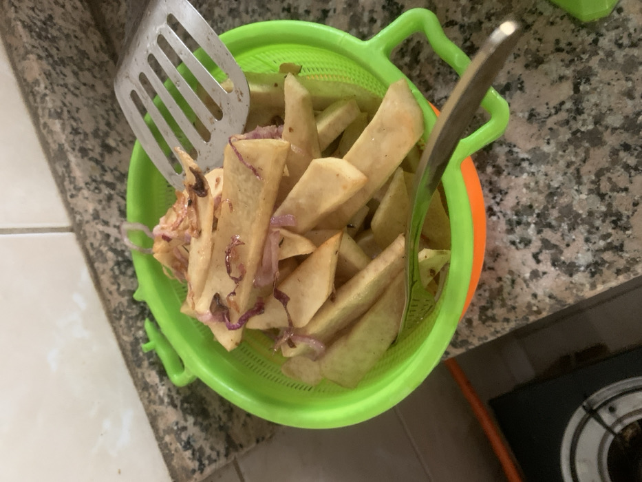A green plastic colander, holding fried yam pieces and caramelized red onions, rests on a speckled granite countertop within a kitchen