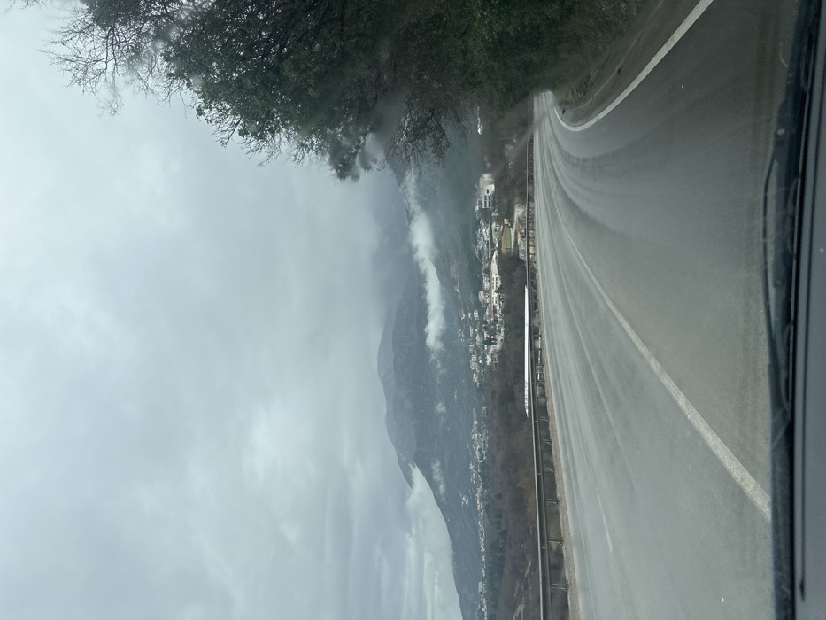 The image displays a wet, two-lane asphalt road observed from within a vehicle, with the dashboard base visible at the bottom. The scene is situated in the vicinity of Prijevor, Montenegro, under an overcast and cloudy sky. The road, marked by a dashed white center line and a solid white line on its right edge, gently curves to the right, reflecting the ambient light. Along the left side of the road, a multi-bar metal guardrail is present. Beyond the guardrail, the terrain slopes downwards into a valley containing sparse, bare deciduous trees and some evergreen vegetation. In the mid-ground, a residential settlement, identified as Prijevor, spreads across the hillside, characterized by numerous white and light-colored buildings with varied roof hues. To the immediate right of the road, a dense line of trees, including both bare branches and evergreen foliage, borders the thoroughfare, with some elements partially obscured by visible water droplets on the vehicle's window. The background features prominent mountains, whose upper reaches and peaks are partially shrouded by low-hanging clouds and mist. The sky above is entirely covered by a uniform layer of grey clouds, indicating overcast and damp weather conditions. No human figures or discernible actions are present in the depicted scene.