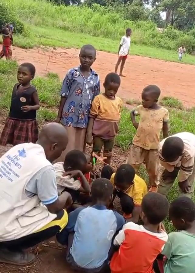 In a landscape with green grass and trees, a group of children surround a man who is kneeling on the ground. The man is wearing a white vest with text on the back. Some children are standing, while others are sitting in a circle on the ground, seemingly focused on something in the center. A black plastic tub with an orange bag inside is placed a short distance away. Children are seen running in the background on a dirt road.