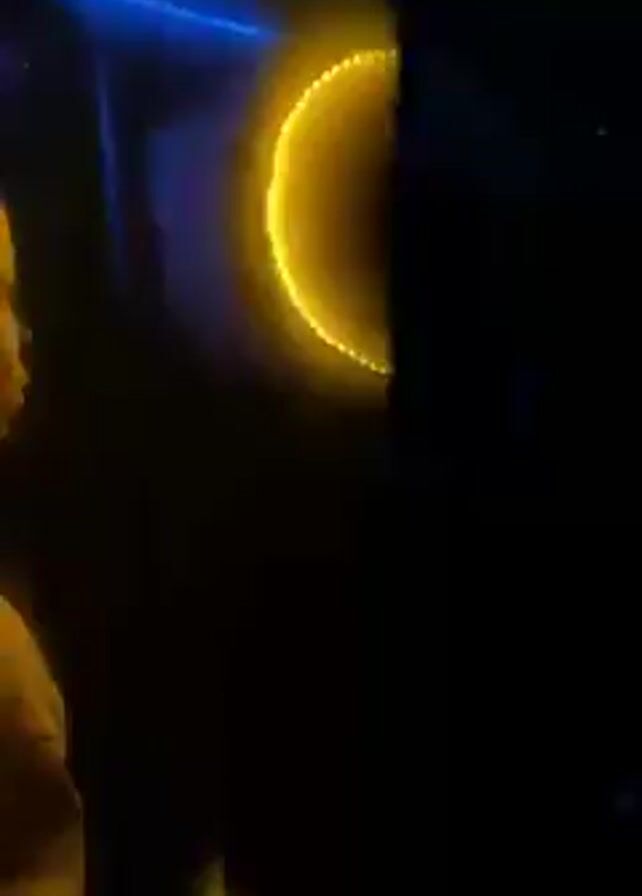 A person wearing an outfit outlined with yellow neon lights dances in a dark, crowded club. The person’s headwear is a neon yellow halo. Other people are visible in the background, blurred by the focus on the dancer. The ambient club lighting is dim with occasional colored lights. The music is loud. The camera moves around, focusing on the dancer’s illuminated figure.