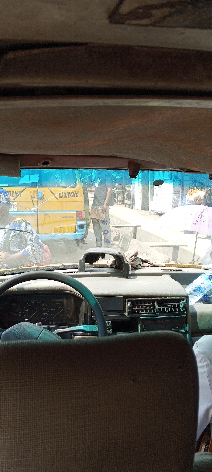 The image displays a street scene in Alasia, Nigeria, viewed from the interior of a vehicle through its front windshield. **Vehicle Interior (Foreground):** The upper portion of the frame shows the light brown, worn fabric ceiling of the viewer's vehicle. The scene outside is framed by a windshield, which has a prominent blue tint or film across its upper section and shows multiple white lines, possibly cracks or applied tape, particularly on the left. A dark grey dashboard is visible below the windshield. A black steering wheel, partially visible on the left, features a teal/blue-green accent on its right rim. Behind the steering wheel, an instrument cluster displays various gauges, with the speedometer marked up to 200. Two rectangular air vents are present on the right side of the dashboard. A dark, U-shaped plastic component rests centrally on the dashboard, with folded brown material to its right. A plastic water bottle lies on the far right of the dashboard. The top of a brown, patterned fabric seatback occupies the lower foreground, partially obscuring the dashboard. A white fabric element, possibly part of another seat or clothing, is visible on the far right. **Street Scene (Midground/Background):** A yellow commercial bus, typical of Nigerian public transport, is positioned in the midground, either stationary or moving slowly. The word "UNION" is visible in dark letters on its rear, along with other partially obscured text. White X-marks are present on its rear window. A license plate is partially visible on the bus's left rear. Two individuals are visible outside the bus: one person in a blue and white patterned garment (possibly a head covering) is partially visible on the lower left, near the bus; another person, wearing a dark shirt and patterned blue and white trousers, stands near the bus's rear, holding a light-colored rectangular object. The ground surface appears unpaved or mixed with dirt and uneven pavement. Concrete barriers or low walls line the roadside. In the background, multiple market stalls or small structures with coverings are visible. An open purple umbrella is present on the right side of the frame. A dark, disc-shaped object is discernible in the sky area to the upper right. Text fragments "OPEN" and "DEPOS" are faintly visible on background signage.
