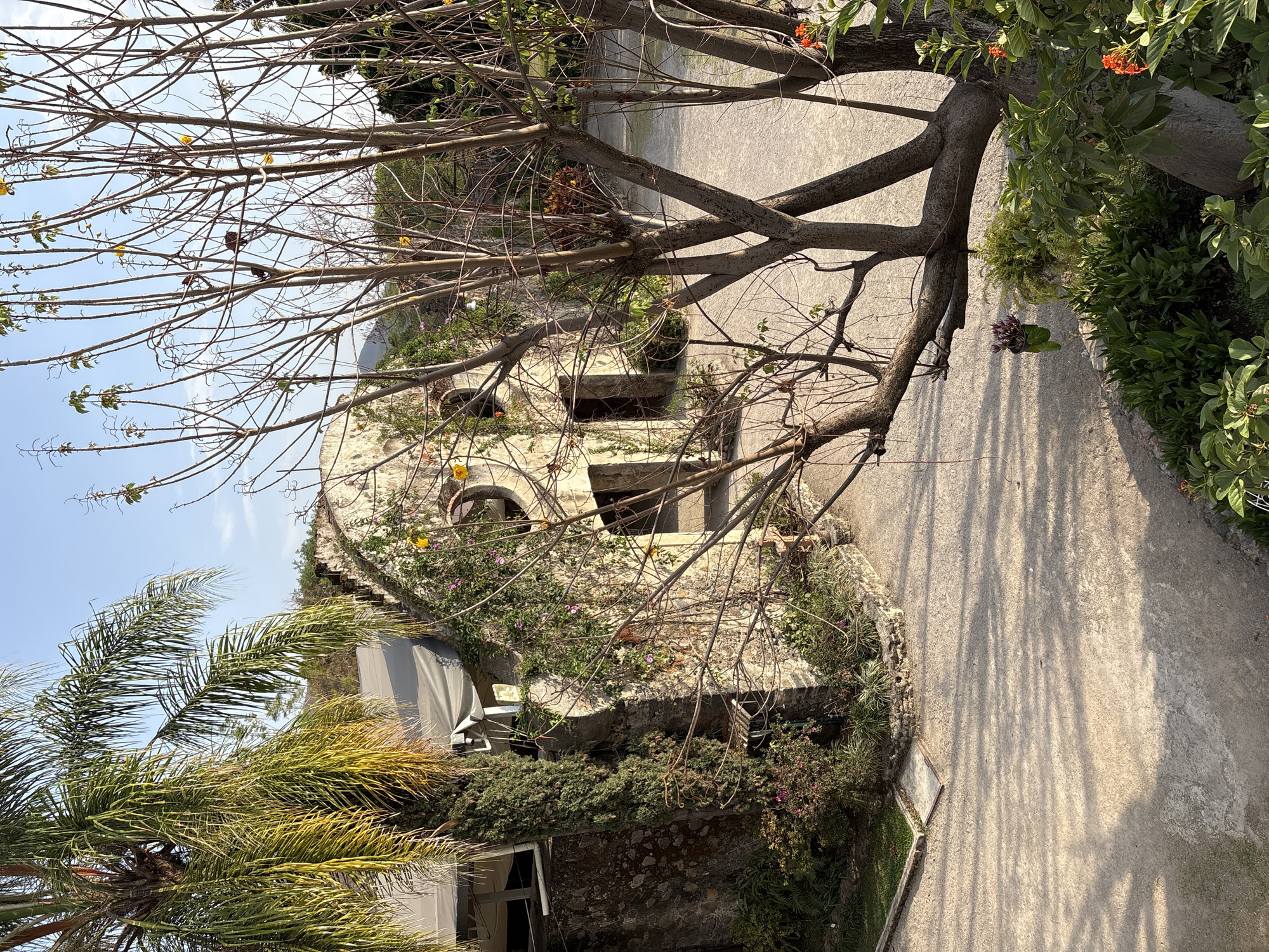 stone structure covered in vegetation, possibly ruins, in Progreso, Mexico. The building has arched windows and is partially obscured by a large, bare tree with few leaves, its branches extending across the frame. A palm tree is visible on the left side of the image. A concrete path leads past the building and casts shadows from the tree. The sky is blue and clear. The scene appears to be outdoors in a garden or park-like setting. No people are visible.
