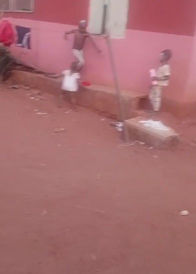 three children playing outside a pink building with white window frames. The ground is red dirt. One child is shirtless, wearing light-colored shorts, and dribbling a basketball. Another child, wearing a white shirt, runs in the same direction. The third child stands near the building holding a cylindrical object, possibly a bottle. There is a metal pole standing upright, as well as litter scattered on the ground. Clothes are hanging on a line in the background.