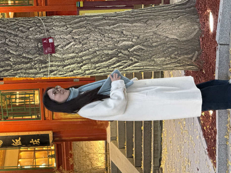 The scene depicts an outdoor urban environment in Xicheng District, China, featuring traditional architecture and a female subject. A woman with long dark hair, wearing eyeglasses, a light-colored (off-white) long coat, and a light blue scarf, stands in profile facing towards the right, her mouth slightly open in a smile. Her right hand holds a portion of her scarf. To her immediate right, a large tree trunk with textured bark rises vertically. A small, rectangular red sign with white text and a QR code is attached to the tree trunk with a wire. The ground at the base of the tree contains red mulch, illuminated by two circular ground lights. The paved sidewalk around this area is covered with scattered yellow leaves, indicating autumn. In the background, a traditional Chinese building is visible, characterized by red wooden pillars, red window frames with intricate lattice patterns, and brightly lit interiors displaying a warm yellow hue. A black horizontal plaque with gold Chinese characters, partially decipherable as "饭店" (Fàndiàn - restaurant/hotel), is mounted above one of the building's windows. A stone staircase with several steps ascends towards the building's entrance on the left side of the frame.