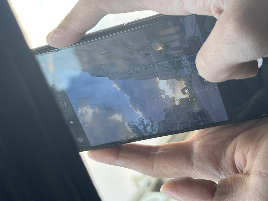 A close-up view shows two hands holding a dark-colored smartphone vertically. The left hand supports the device, with fingers wrapped around the side, while the right thumb is positioned over the lower-right portion of the screen, appearing to interact with the camera interface. The phone's screen, which displays visible scratches and air bubbles on its protector, shows a live camera feed of a street scene in Zamalka, Syria. The scene captured on the phone screen depicts a cloudy blue sky with patches of sunlight. A prominent sun disk, near the lower-middle of the frame, generates a visible lens flare. Multiple multi-story buildings, constructed from light-toned material, line both sides of a street, extending towards the upper part of the frame. These structures exhibit signs of wear. On the street level, a light-colored vehicle is partially visible, and a dark two-wheeled vehicle equipped with a red rear storage box is also present. Tree branches with sparse foliage are silhouetted against the sky on the left side of the screen. The camera interface overlays a 3x3 grid on the scene. At the top of the screen, icons for settings (gear), flash (lightning bolt), and timer are visible. In the lower-middle, a circular exposure control is displayed, featuring a sun icon, a "6" icon, and indicating a "-.5" exposure compensation value.