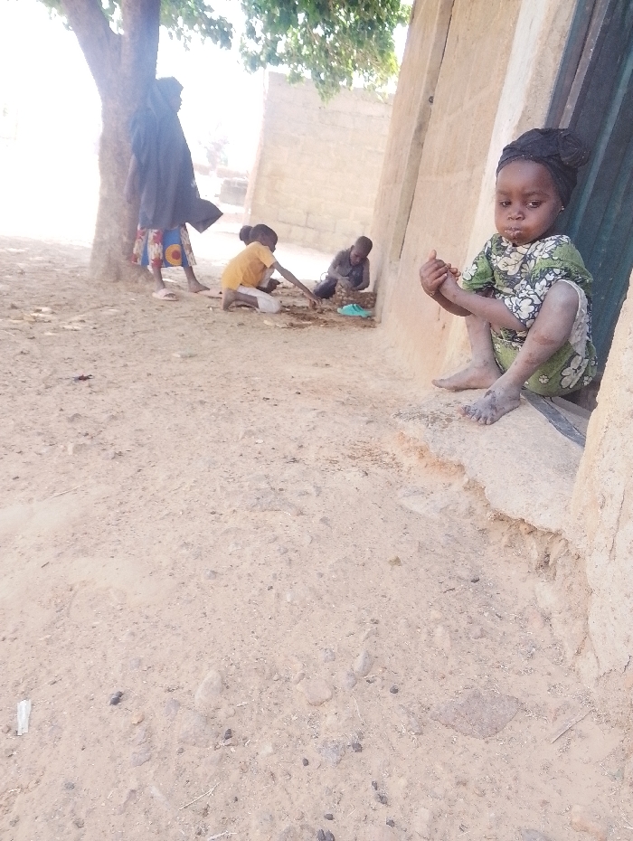 This image captures an outdoor scene in Kanwa, Nigeria. In the immediate foreground, a young child, approximately 2-4 years old, sits on a raised concrete ledge of a light-colored, possibly mud-brick or block, building on the right. The child is wearing a green and white patterned dress, a dark headwrap, and has visible dirt on their bare feet and lower legs. Their hands are clasped in front, and they are looking directly forward with a neutral expression. In the middle ground, to the left of the scene, three other individuals are present on a dry, light brown dirt ground containing small rocks and sparse debris. To the far left, partially obscured by the trunk of a tree, stands an individual wearing a dark, long-sleeved outer garment over patterned clothing, with white sandals visible on their feet. Closer to the center, two other children are crouched or sitting on the ground. One child, wearing a yellow shirt and light-colored shorts, is actively manipulating or playing with dirt and small objects on the ground with their hands. Adjacent to this child, a second child, dressed in darker attire, is also focused on the ground, near a light blue object resembling a small bowl or container. The background features more structures made of light-colored blocks or packed earth. The scene is illuminated by natural daylight.