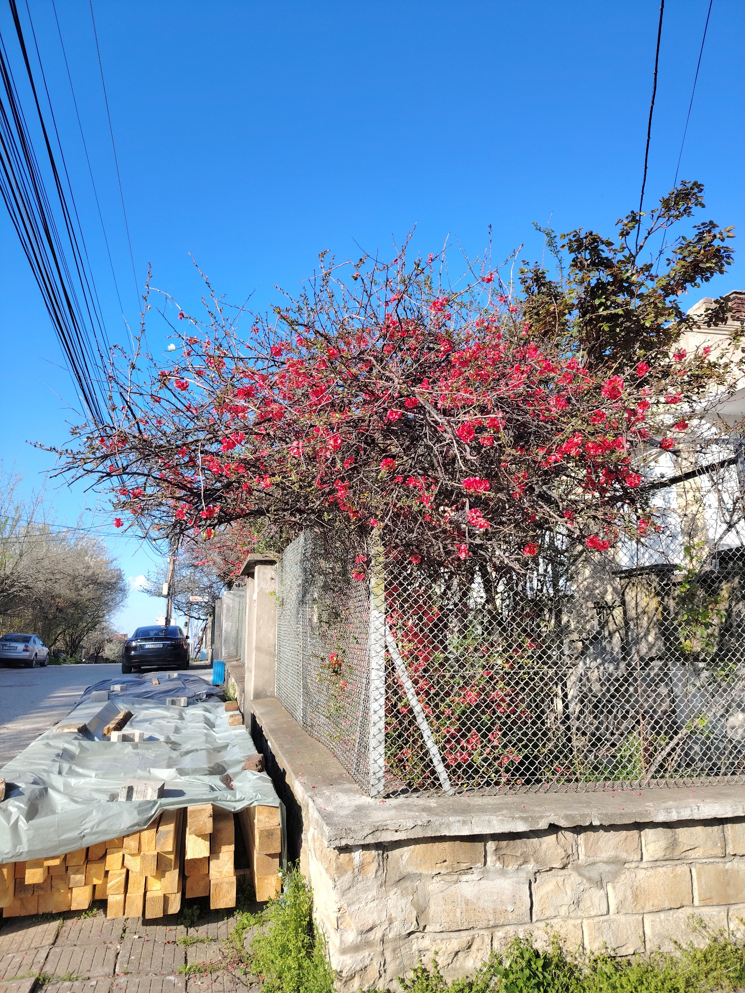 The image depicts a street scene in Gorna Oryahovitsa, Bulgaria. A low stone wall and chain-link fence enclose a property overgrown with flowering bushes bearing red blossoms. Behind the fence, a house is partially visible. A stack of lumber covered with a gray tarp sits on the sidewalk adjacent to the wall. A street with two parked cars and a passing black SUV is visible. Overhead are multiple black power lines against a clear blue sky. The scene is well-lit, suggesting a sunny day.