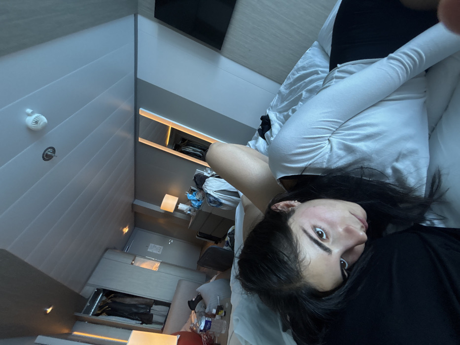 The image depicts an indoor scene within a modern cabin or hotel room, viewed from a low angle. The specific location within San Miguel de Cozumel, Mexico, cannot be determined from visual evidence in the image. In the foreground, a young female individual is partially reclining on a bed with white bedding, her head resting on a dark pillow. She has long, dark hair and dark eyebrows, and her gaze is directed towards the camera. She is wearing a light-colored, long-sleeved top and dark lower garments. Partially obscured behind her on the bed, a bare leg is visible. The room features a white, paneled ceiling with recessed lighting fixtures and a white smoke detector/sprinkler unit. To the left, an open wardrobe reveals various dark garments hanging inside. A bedside table next to the bed holds a lamp, a red spherical object, a clear water bottle, and other small containers. In the mid-background, a dresser with multiple drawers supports another lamp with a white shade, along with scattered items including bags and articles of clothing. Adjacent to the dresser, a large, vertically oriented mirror with illuminated edges reflects an additional area of hanging clothes. A dark, rectangular screen, consistent with a television, is mounted on the wall to the far right. A closed, light-colored door is visible in the central background. The room appears to be in a state of casual occupancy.