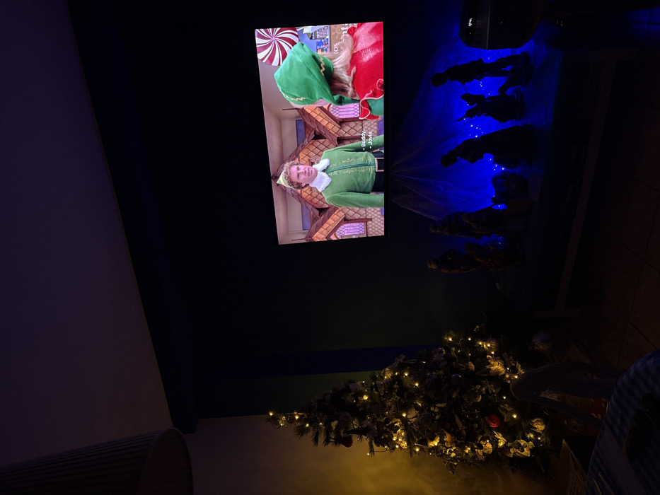 The image captures a cozy living room setting. A flat-screen TV displays a scene from the movie "Elf," featuring Will Ferrell. Above the TV, decorative figurines are backlit with blue lighting. Below, a Christmas tree adorned with lights and ornaments adds a festive touch. The room is dimly lit, creating a relaxed atmosphere.
