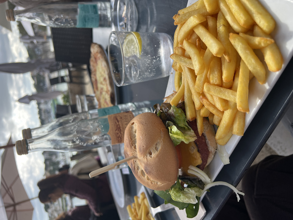 The image depicts an outdoor dining scene in Porto Cristo, Spain, focusing on food and beverages at a table with a waterfront background. In the immediate foreground, a plate holds a large burger and a generous serving of golden-brown french fries. The burger features a light brown bun with a patterned top, held by a wooden skewer, encasing a patty, melted yellow cheese, lettuce (both green and red-tinged), a red tomato slice, and white onion rings. To the left, a smaller plate contains additional french fries. To the right of the main food plate, a clear glass filled with sparkling water, ice, and a lemon wedge is visible. Behind it, a small, circular white ashtray contains two cigarette butts. Two tall, clear glass bottles stand on the table; one has a blue label visible at its base, and the other, slightly behind it, has an orange-brown label. Further back on the table, a blurred pizza with a cheese topping is visible. The table surface is dark. On the left side of the frame, a person wearing a dark maroon or purple top is seated, partially visible and blurred, facing away from the camera. The lower left corner shows a partial view of a person's dark-clad lap. The background reveals a bustling outdoor restaurant environment. Several blurred tables and chairs are visible under large, light-colored parasols. Beyond the restaurant, a harbor or marina stretches, populated with boats and white buildings lining the waterfront. Hilly terrain rises in the distance under a partially cloudy sky. The overall scene suggests a bright, daytime setting.