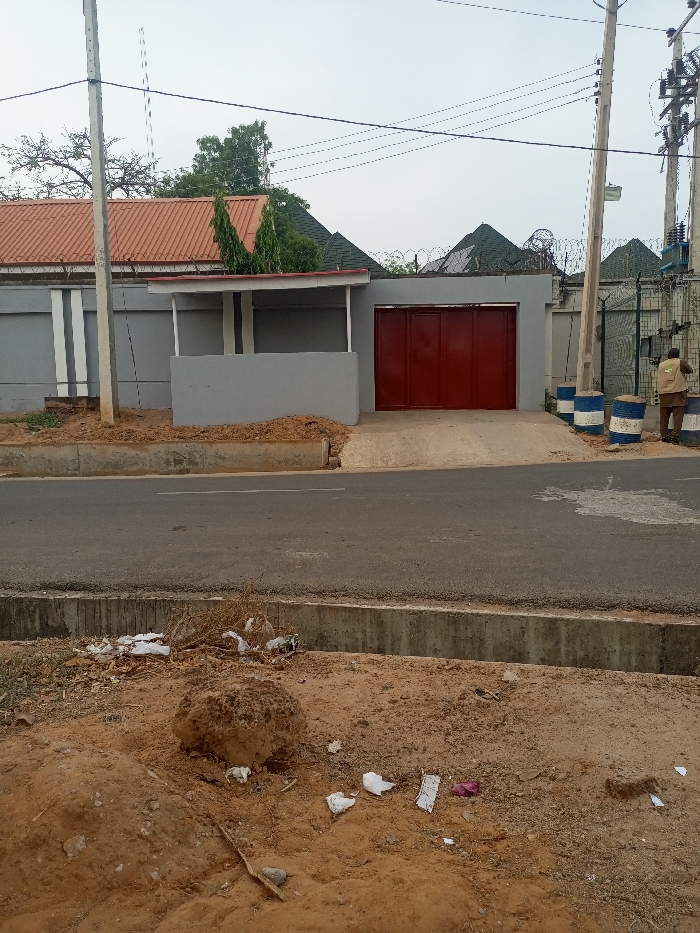 street scene in Maiduguri, Nigeria. The scene is taken from a low angle, with a street in the foreground. The street is paved and appears to be in a residential area. There is a concrete curb and a drainage ditch on the right side of the street. The ground is covered with dirt and some debris, including a large rock in the center of the image. The street is empty except for a single person walking away from the camera, but there is a structure in the background. The structure is a two-story building with a red metal gate. The building is painted gray and has a small overhang over the gate. The building is likely a residence. There are multiple power lines running overhead and a few trees and bushes scattered in the background. The overall image is typical of a developing city, with signs of both urban and rural features.