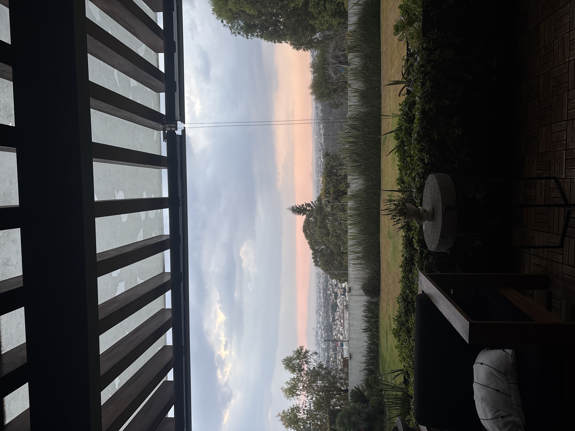 The image displays an elevated outdoor patio or balcony providing a panoramic view of the city of Puebla, Mexico, observed during dusk or dawn. In the foreground, a dark wooden pergola with translucent or frosted panels between parallel beams extends across the top of the frame. Below, a dark-colored outdoor sofa with a wooden frame is partially visible on the left, featuring a white pillow with black striped and dotted patterns. To the right, a round, light-colored stone or concrete side table with a dark base holds a small potted succulent. The flooring beneath is composed of dark brown, rectangular outdoor tiles. Beyond the immediate patio, a lush green hedge and taller, spiky green plants separate the area from a manicured lawn, which exhibits both green and drier yellowish patches. A light-colored concrete wall, topped with a dark security barrier, marks the property line. Various trees with dense green foliage are present, including lighter-barked trees on the left and a distinct conifer on the right. In the mid-ground, a sprawling cityscape of Puebla is visible, characterized by numerous buildings and urban development, partially obscured by atmospheric haze. Distant hills or mountains form the horizon. The sky is overcast with scattered clouds, displaying a soft pinkish-orange glow directly above the horizon, transitioning to greyer and whiter tones higher up. No individuals or active interactions are present in the scene.
