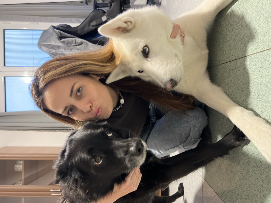 - "A woman with long, highlighted brown hair poses with two dogs" by FM-aQUtB3, licensed under CC BY 4.0