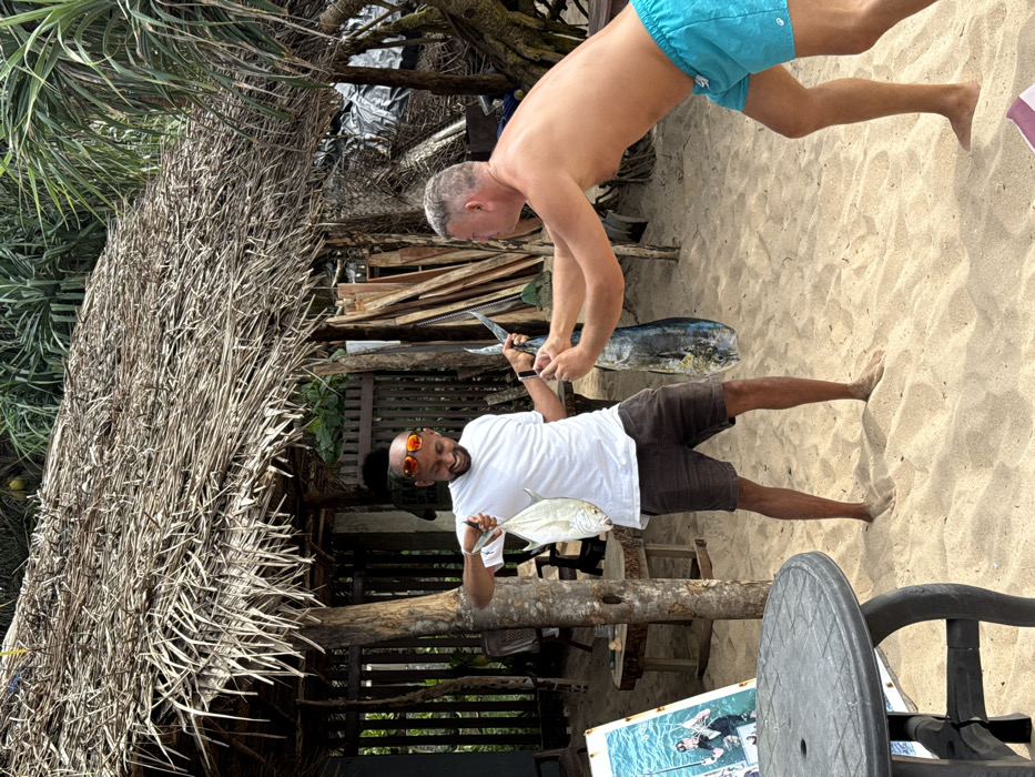 Two men display their catches. One, shirtless in blue shorts, holds a long fish, a knife in his other hand. The other, wearing a white t-shirt, brown shorts, and sunglasses, shows off a smaller fish. They are on a sandy beach near a wooden structure with a thatched roof. A table and chair are partially visible in the foreground. The setting appears tropical.