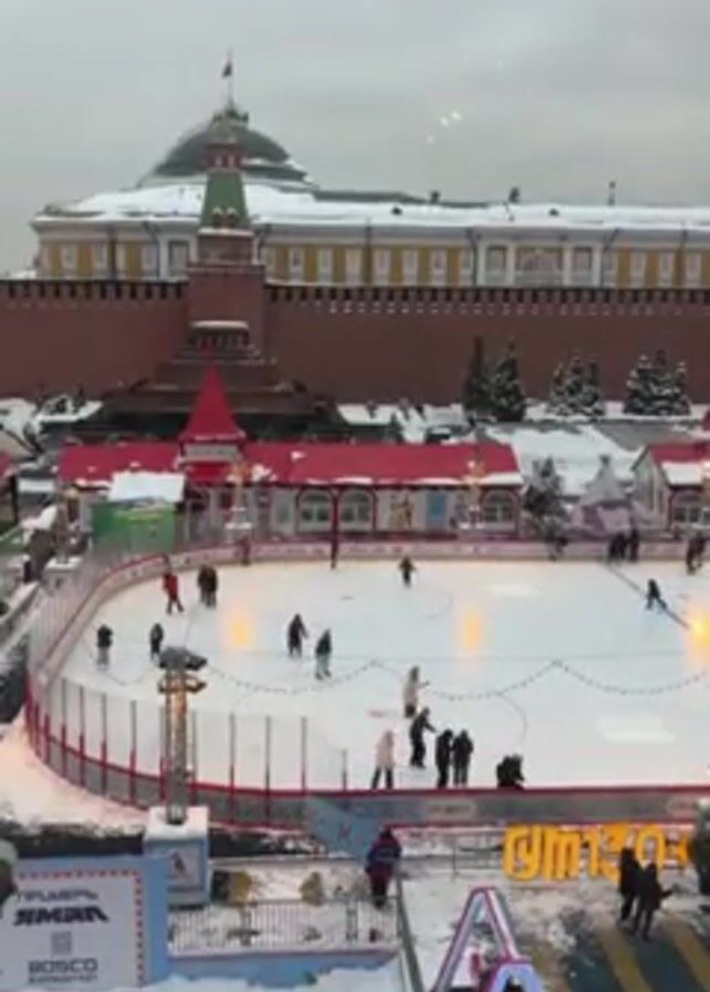 n outdoor ice-skating rink, crowded with skaters of various ages, beneath an overcast sky. The rink is surrounded by festive decorations, small building-like structures with red roofs, and artificial snow. In the background stands a large brick building with a tower topped with a flag, possibly a historic structure, and the ground is covered in snow. The video is shot from an elevated position, offering a wide view of the rink and its surroundings, including advertisement banners and a decorative archway.