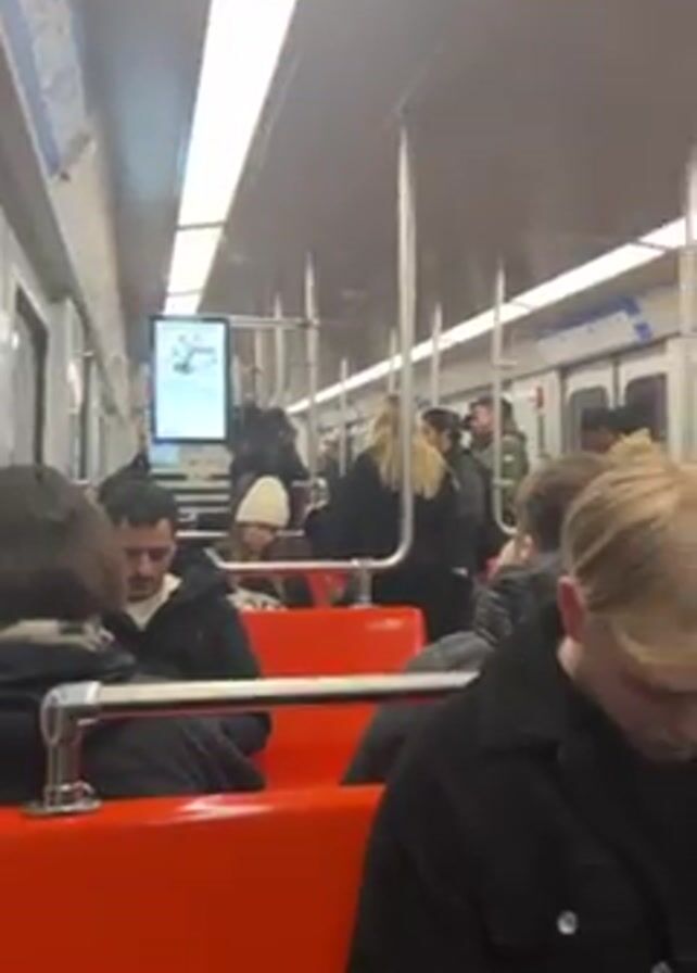 inside of a subway train. Several people are either seated or standing, occupying the space. The seats are orange, and some individuals are wearing winter clothing. A digital screen displays what appears to be an advertisement or announcement. Through the windows, the platform of a subway station is visible. The train seems to be moving along the tracks.