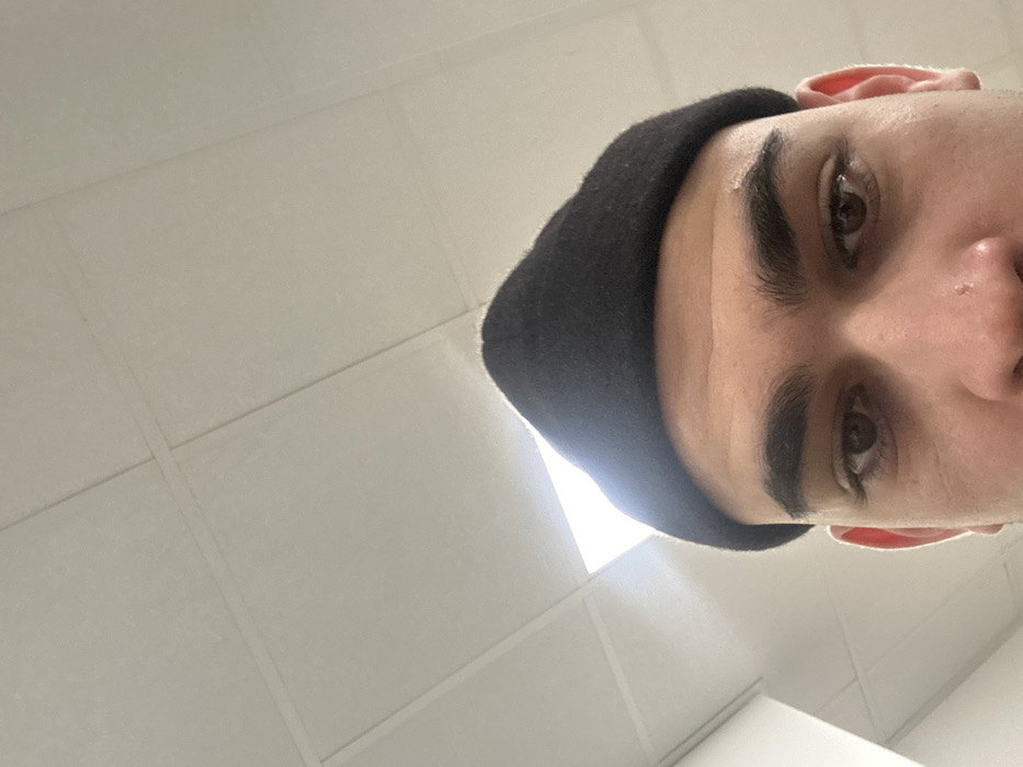 - "A close-up, low-angle shot captures the face of a male subject wearing a black beanie that covers the top of his head and forehead" by FM-ibjR62, licensed under CC BY 4.0