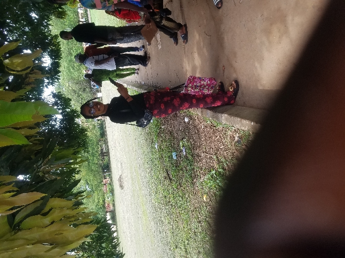 The image portrays an outdoor scene within Awka, Nigeria. A young woman with braided hair and dark-framed glasses stands prominently on a concrete pathway in the middle ground, smiling towards the camera. She wears a black long-sleeved shirt, dark red trousers with a floral pattern, and black sandals featuring gold embellishments. A black shoulder bag with a white logo is visible, and she holds a black smartphone in her right hand. To her left, a large, unkempt grassy area extends into the background, characterized by sparse vegetation, scattered litter, and distant trees under an overcast sky. To her right, on the same pathway, a group of approximately five to seven individuals are present. This group includes a person in a bright green outfit walking away, a man in a white polo shirt and a cap, a man in a red shirt, and a man in a black shirt, all standing or partially visible. Some individuals further right appear to be seated. The immediate foreground is partially obscured by a dark, out-of-focus object in the lower-left quadrant. Overhead foliage from a tree casts shadows, indicating natural daylight.