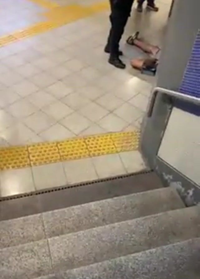 The video depicts a man lying on a tiled floor in what appears to be a public space like a subway station. He is shirtless, wearing shorts and sneakers. There are visible wounds on his body that are bleeding. A police officer in uniform stands nearby, taking pictures with a phone. Another individual in casual clothes stands in the background. The scene is partially captured from the vantage point of someone standing at the top of a set of stairs. A handrail is visible on the right side of the frame. The lighting is bright, typical of an indoor public space.