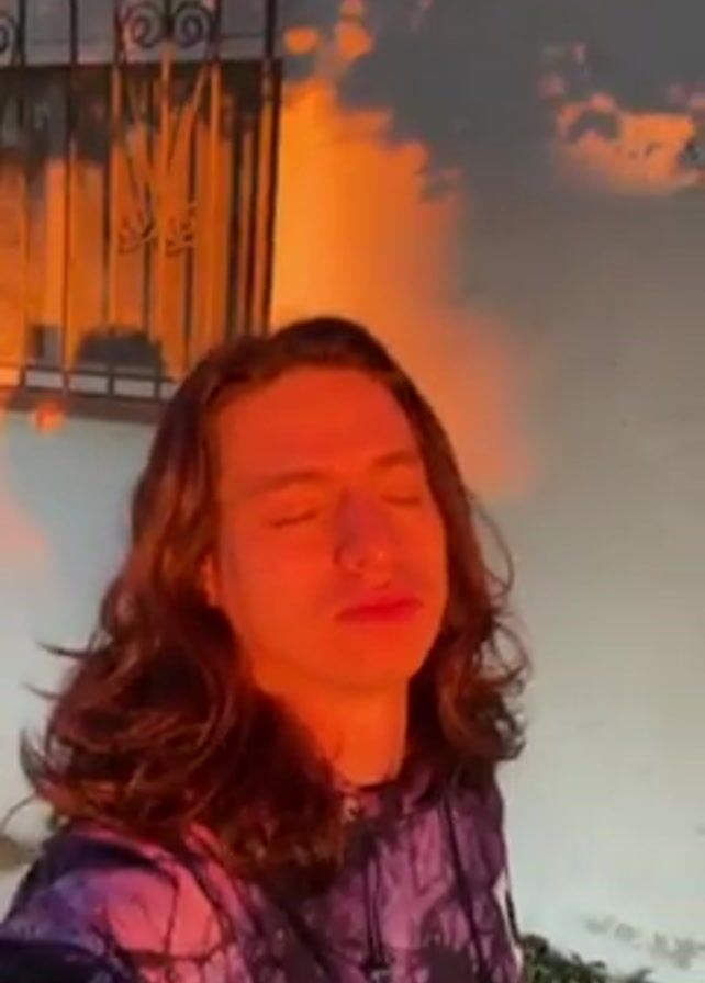 A young man with long brown hair and wearing a purple hoodie stands outside in the orange light of the setting sun. He has his eyes closed, then opens them and looks into the camera. A white wall is behind him with a shadow cast on it from a barred window. A bit of greenery is visible in the bottom right corner of the frame.