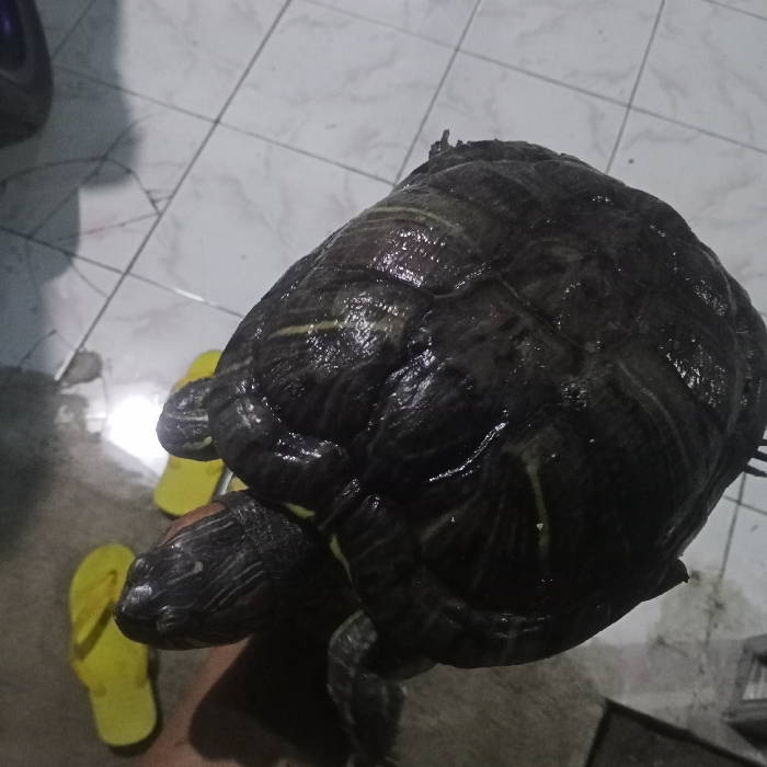 A dark-shelled turtle, identified as a Red-eared slider (Trachemys scripta elegans) due to discernible markings, is held aloft by an unseen individual. The turtle's carapace is wet and dark, displaying distinct scutes with faint lighter striations. Its head is extended. In the background, two yellow flip-flops rest on a light-colored, square-tiled floor, which exhibits dampness and reflectivity. A partial view of a human limb or foot is visible near the footwear. The scene is illuminated by artificial light, suggesting an indoor or sheltered outdoor setting within the city of Unknown, Unknown.