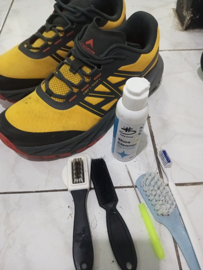 A pair of Eiger shoes, yellow with black trim and red soles, sits on a tiled surface. Beside the shoes are cleaning supplies: a bottle of "holy shine Shoe Cleaner", two black-handled brushes, a light blue toothbrush, and a green-handled pointed tool. The items appear arranged for shoe cleaning.