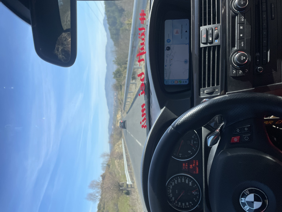 - "The image depicts a first-person view from the interior of a BMW vehicle, specifically a model with an E-series dashboard design, traveling along an asphalt road under a clear blue sky in Drianova Glava, Bulgaria" by FM-vtPgi2, licensed under CC BY 4.0