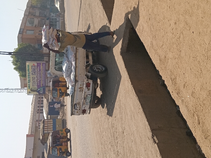 This image depicts a street scene in Sabon Gari East, Nigeria, under clear, bright daylight conditions. In the immediate foreground, a wide, uncovered earthen trench or drainage canal runs diagonally from the lower left to the lower right, separating the viewer's perspective from the activity beyond. The ground surrounding the trench is dry, light brown soil with visible tire tracks and footprints. Centrally positioned in the midground is a light-colored, small pickup truck with an open bed, parked on the dirt shoulder of a paved road. The truck's bed contains several white sacks. A male individual, wearing a light-colored, short-sleeved shirt and dark trousers, stands behind the truck, facing away from the viewer. He is actively carrying a stack of white sacks on his head, transferring them, likely to or from the truck. Another person's lower legs and shadow are partially visible behind him. Further in the background, on the paved road, two yellow and brown three-wheeled auto-rickshaws (Keke Napeps) are present; one is parked on the left, and another is positioned more centrally. A third individual in a light-colored shirt is visible walking towards the left in the background. The background features a row of multi-story buildings lining the street, some appearing to be commercial or residential structures. A prominent billboard on the left displays an image of a man in a suit and text, including "EAST BAPTIST CHURCH." A tall metal telecommunications tower stands in the far background on the left. Scattered vegetation and utility poles are also discernible. The overall environment suggests an active urban or semi-urban area with ongoing commercial or transport activities.