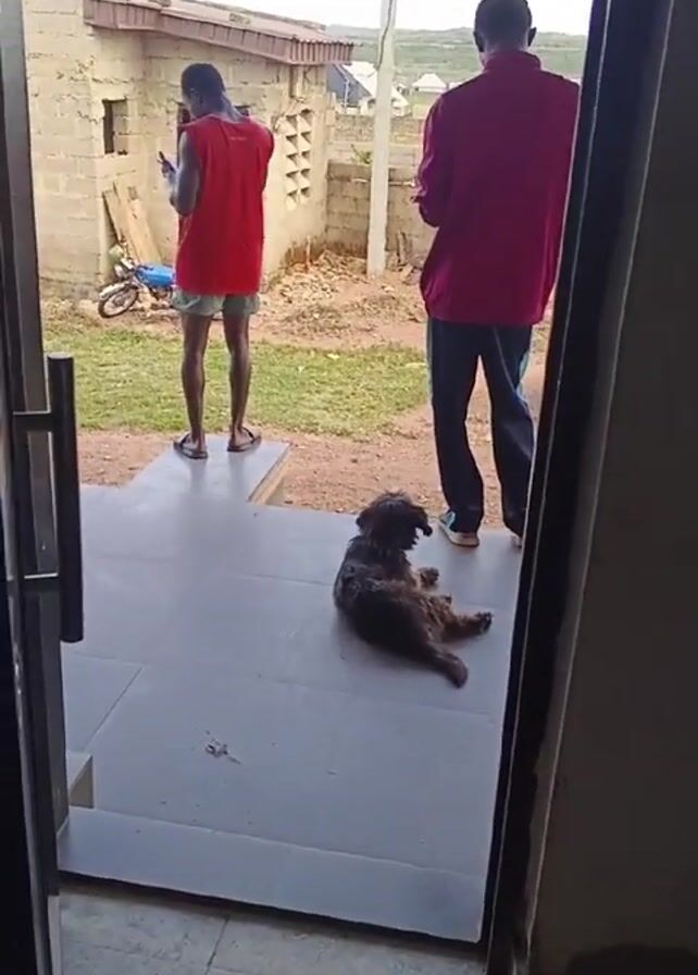 From an indoor perspective, a partially open doorway reveals two men and a dog on a tiled porch. The man to the left wears a red tank top and shorts, looking at his phone. The man on the right is wearing a red long-sleeved shirt and dark pants, standing with his arms crossed. A small brown dog lies on the porch floor. In the background, there is a brick building, some grass, and a bicycle lying on its side. The sky is overcast.