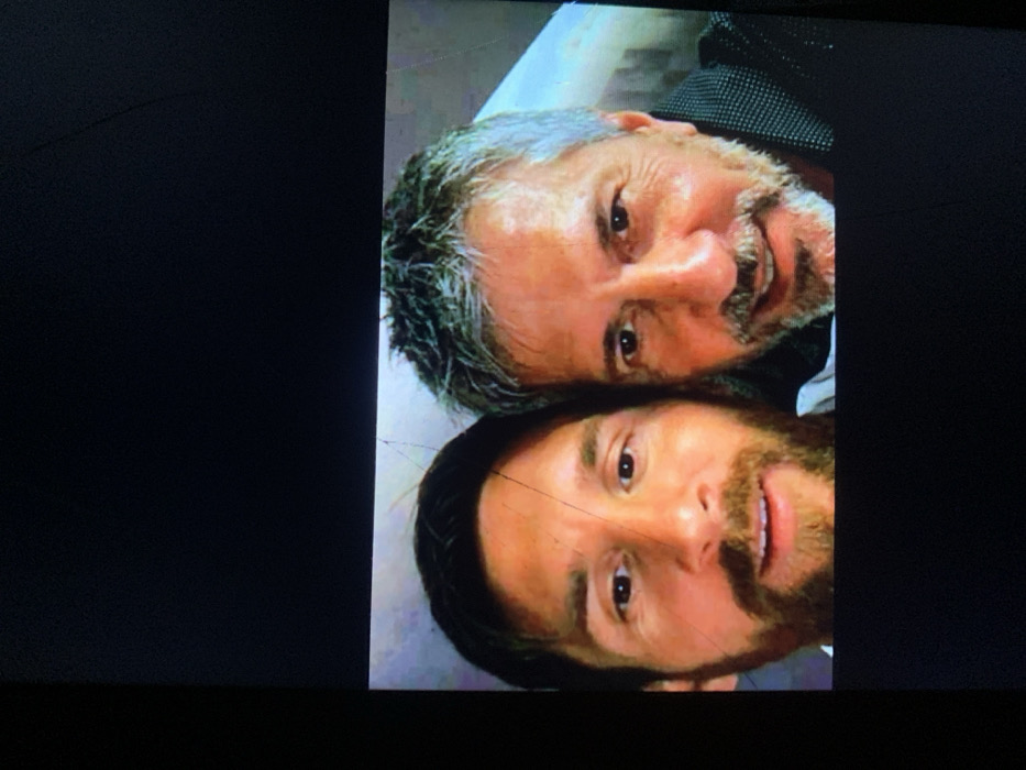 This image is a photograph of a digital screen displaying a selfie of two adult males