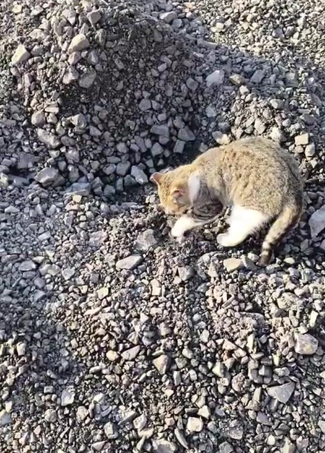 brown and white cat on a ground covered in small gray rocks