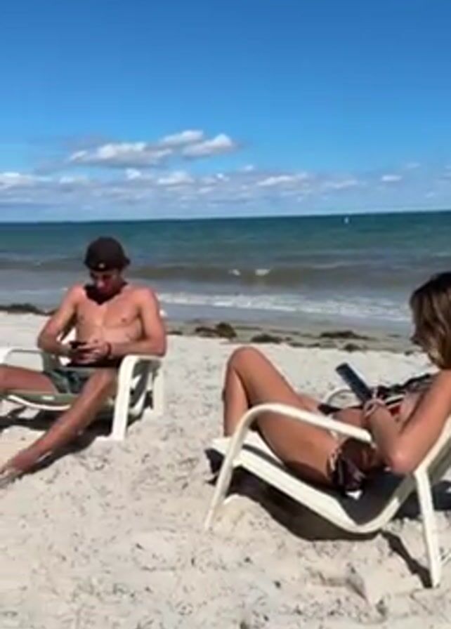 Three people are sitting in white plastic lawn chairs on a sandy beach, each engaged with their cell phones. All three are shirtless. The woman is wearing a bikini. The sea is choppy and the sky is blue with white clouds. Seaweed is visible on the shoreline.