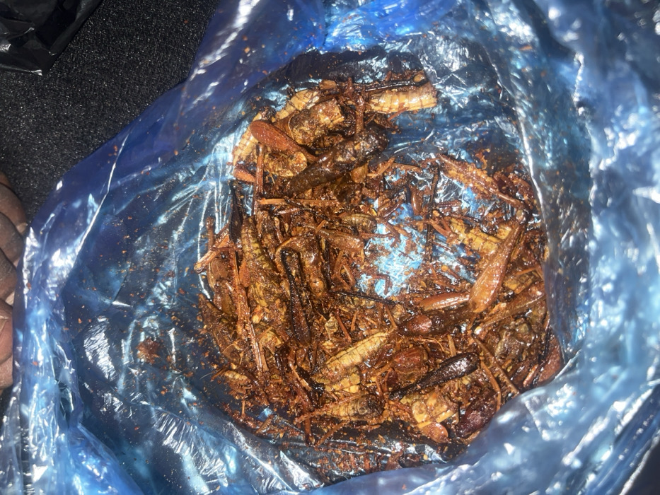 - "The image captures a close-up, top-down view of an open, translucent blue plastic bag containing a quantity of seasoned, fried or roasted insects, specifically identified as grasshoppers or locusts" by FM-d8Pvz1, licensed under CC BY 4.0