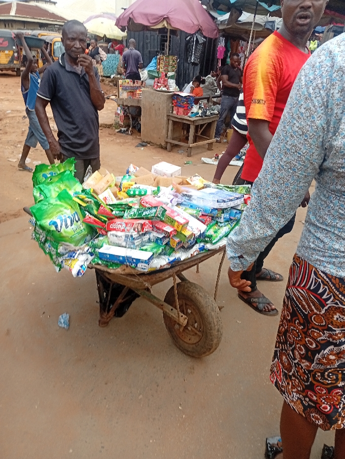 The image depicts a bustling street market scene in Onitsha, Nigeria. In the foreground, a rusty, single-wheeled wheelbarrow laden with various packaged consumer goods dominates the center. Prominently visible items include multiple green bags of "TIDDO" detergent, alongside numerous smaller packages containing items such as toothpaste (e.g., Close-up, Colgate), snacks, and candies. To the left of the wheelbarrow stands a dark-skinned male, bald or with closely cropped hair, wearing a dark grey short-sleeved polo shirt. He has an object, possibly a stick or candy, in his mouth and his left hand is raised towards his face. His gaze is directed slightly to the left. On the far right, a person is partially visible, wearing a light blue patterned long-sleeved shirt and a brown, orange, and white patterned skirt or shorts. Their legs and feet, adorned with black sandals, are near the wheelbarrow. Another dark-skinned male, wearing a red and orange short-sleeved shirt, stands partially visible on the right, also wearing dark sandals. In the midground, behind the wheelbarrow and the central figures, a lively market area unfolds. Makeshift stalls constructed from wooden tables and covered by large, faded umbrellas (one pink/red, one green/blue) line the street. These stalls display additional packaged goods and hanging clothing. Multiple individuals are scattered throughout this area, engaged in market activities. A young boy in a blue t-shirt and light shorts is visible to the left, behind the man in the dark shirt, with his arms slightly raised. The ground is a reddish-brown, dusty surface. In the background on the far left, an orange and black auto-rickshaw (Keke Napep) is partially visible, indicating a busy thoroughfare. Buildings with light-colored walls and dark roofs are discernible in the distance. The scene overall conveys an active, outdoor commercial environment.