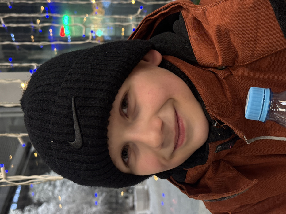 A portrait-style image depicts a young male, approximately 8-12 years of age, facing the viewer with a slight smile. He is wearing a black ribbed knit beanie featuring a black Nike swoosh logo on the front, and an orange-brown winter jacket over a black fleece garment. A transparent plastic bottle with a light blue cap is partially visible in the lower right foreground. The background is out of focus, displaying vertical strands of multicolored decorative lights (blue, yellow, green, red) and indistinct shapes possibly indicating a snow-covered outdoor environment. The scene is set in the city of Apatity, Russia, during what appears to be evening or night in cold weather.