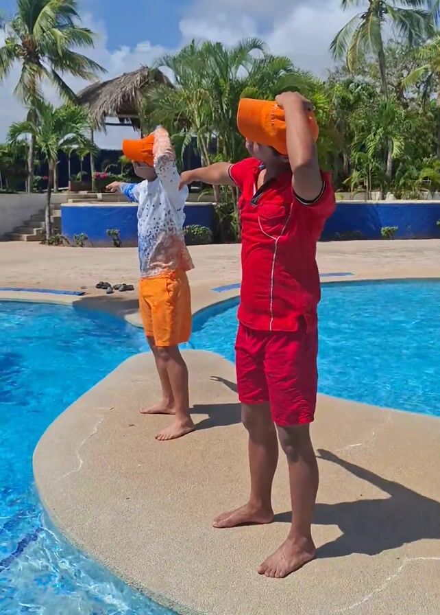 swimming pool with a clear blue sky, surrounded by palm trees and thatched-roof structures. Two men stand at the edge of the pool wearing orange baseball caps, one in a red shirt and shorts, and the other in a white shirt and orange shorts. As the video pans, several children are seen playing in the pool, some with inflatable rings and kickboards. The children are swimming and interacting in the water, and the overall scene is bright and sunny, indicative of a resort or vacation setting.