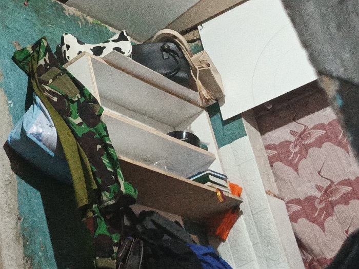 This image depicts an interior, utilitarian space within a residence in Bandung City, Indonesia, captured from an upward, angled perspective. A central, multi-tiered shelf unit, constructed from light-colored wood or painted white, holds various objects. On the top shelf are a black-and-white cow-print cushion, a black handbag, and a light-colored woven straw hat or bag. The middle shelf contains a dark bowl or pan. The bottom shelf holds a stack of dark-spined books and a small orange rectangular object. A camouflage-patterned jacket or shirt hangs to the left of the shelf unit, partially obscuring a light blue plastic bag. Dark fabric, likely clothing or a bag, is visible below the bottom shelf. The wall to the immediate left features faded, rough teal-green paint. The wall to the right is covered with wallpaper displaying a repeating pattern of stylized pink or red cranes in flight against a lighter background. A section between these walls shows white textured paneling with a teal-green trim. In the upper right, a white rectangular board or panel, marked with faint circular lines, is mounted on the wall. No individuals are present in the scene.
