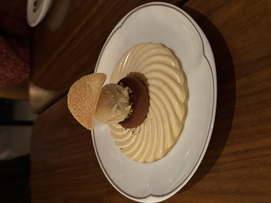 A dessert is presented on a white plate. It features a circular base layered with a light brown frosting in a swirled pattern. A dark brown, half-moon-shaped cake sits atop the frosting, accompanied by a scoop of light-colored ice cream. A half-moon-shaped cookie with a textured surface leans against the ice cream. The plate has a decorative, scalloped edge and a thin gold rim. The table is a dark wood.