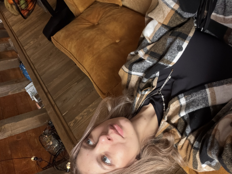 An individual is depicted reclining indoors on a mustard yellow upholstered sofa in Доња Брезна, Montenegro. The subject is a young adult female with light-colored hair and blue eyes, looking upwards and to the viewer's left. She wears a black top beneath an open plaid shirt jacket with beige, brown, black, and white patterns. Two layered necklaces are visible: one with small white beads and another silver-toned chain. The background features exposed wooden ceiling beams and paneled walls. On an elevated shelf in the upper left, a decorative metal bicycle-shaped object with a basket and two small hanging light bulbs are visible. Further back, various packaged items, including a blue bag, are stacked on a shelf. In the upper right, a fruit bowl containing assorted fruit is partially visible.