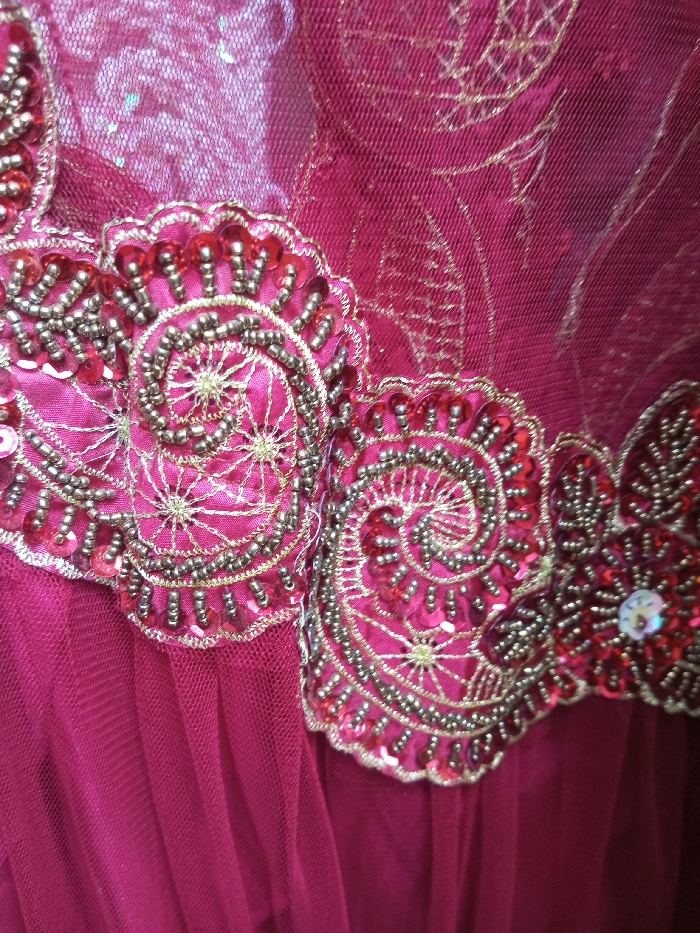 - "A close-up photograph depicts a section of magenta-colored textile adorned with intricate embellishments" by FM-BVHNA2, licensed under CC BY 4.0