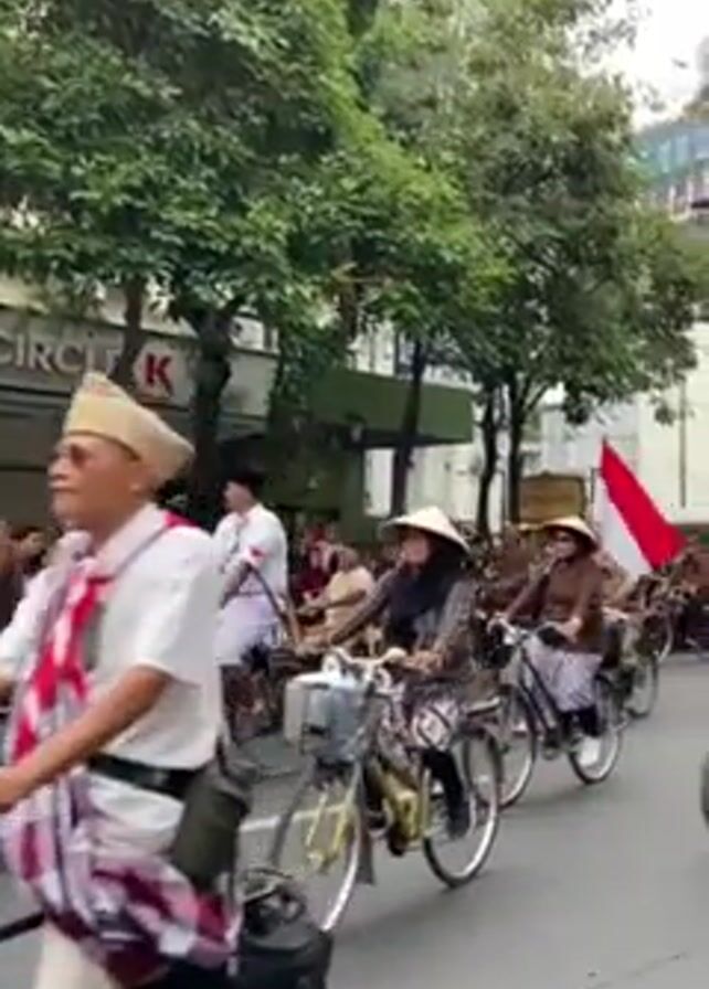 A parade of people ride bikes down a city street. Some of them are wearing traditional Indonesian clothing, like a white shirt with a red and white scarf, a brown jacket and conical hat, or a helmet. The bikes are mostly vintage with some newer ones mixed in. Some of the people are carrying Indonesian flags. They are riding past onlookers behind a barrier, and storefronts with a Circle K sign are visible. There are trees lining the street. The weather appears overcast.