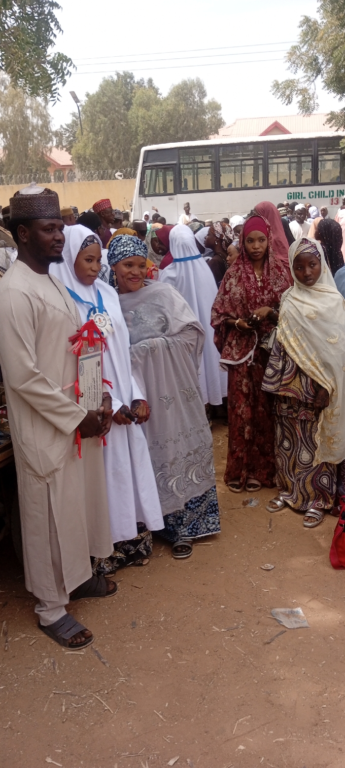 The image depicts an outdoor gathering in Sani Mai Nagge, Nigeria. In the foreground, from left to right, stand a man and four females. The man wears a light beige long tunic and matching cap, and dark sandals. He holds the hand of the woman next to him, who is dressed in a white head covering and long white garment. She wears a blue and white medallion around her neck and holds a framed certificate adorned with red ribbons. Henna is visible on her hands. Next to her, a woman in a blue and white patterned head covering and a grey embroidered top over a blue patterned skirt stands smiling, wearing dark sandals. To her right, a woman in a red head covering and a long red floral dress holds a string of beads in her left hand, wearing silver sandals. A younger female stands furthest right in the foreground, wearing a beige head covering with gold embroidery and a long beige and gold patterned dress, also with silver sandals. The ground is light brown dirt with scattered small twigs and paper debris. In the midground, a crowd of numerous individuals, predominantly adults in traditional attire and head coverings, extends behind the main subjects. In the background, a large white bus is visible, with "GIRL CHILD IN" printed on its side. Behind the bus, a fence topped with barbed wire runs horizontally. Further back, trees and a building with a reddish roof are partially visible under a bright sky. The scene appears to be a formal event or celebration.