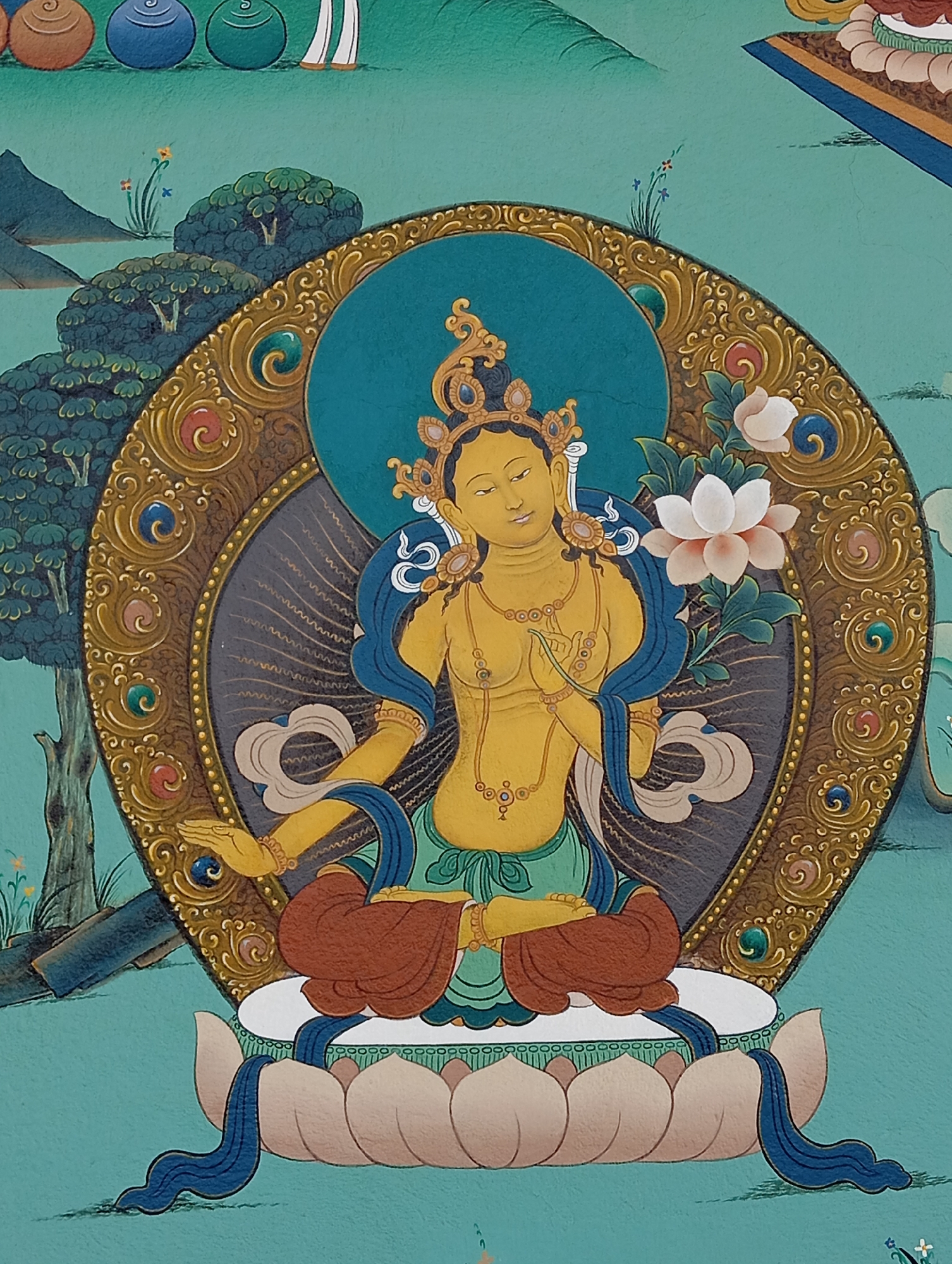 The image depicts a Buddhist thangka painting. The central figure is a deity, likely Tara, seated in a lotus position on a white lotus flower. The deity is golden-skinned, adorned with jewelry and a crown, and holds a white lotus flower in their left hand. They are surrounded by an elaborate golden halo. The background includes trees, mountains, and other decorative elements. The color palette is dominated by turquoise, gold, and shades of blue, brown, and green. This type of painting could be found in a monastery or cultural center in Lumbini Sanskritik, Nepal, though this is a contextual inference not visible in the image itself.