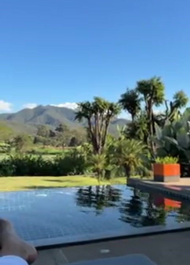 A person lies on a chaise lounge near a pool. The person's feet are visible at the bottom of the frame. Beyond the pool is a green lawn, palm trees, and other trees. In the distance are mountains, and the sky is a clear blue.