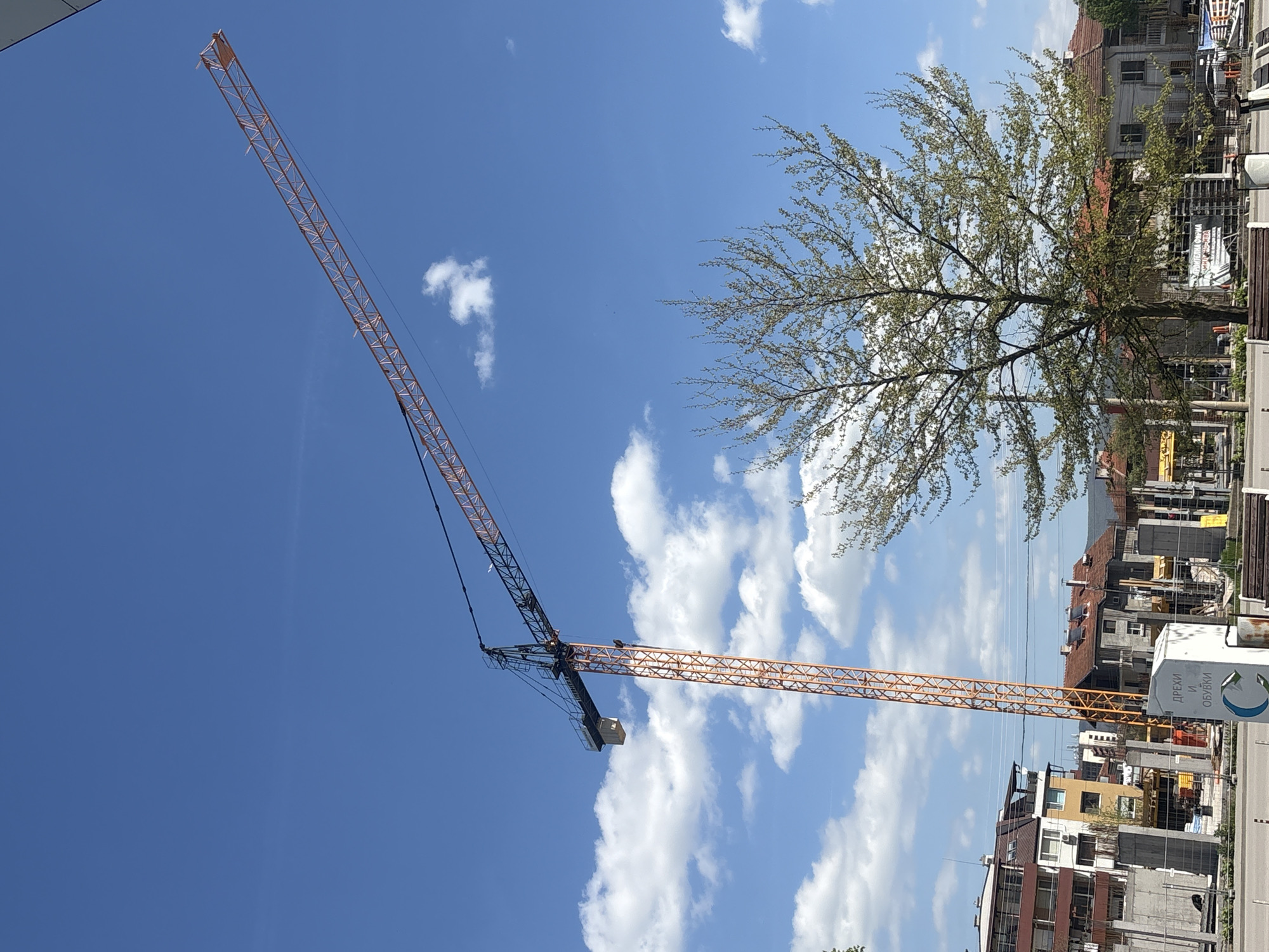 construction site in Botevgrad, Bulgaria, featuring a large yellow and black construction crane against a partly cloudy blue sky. The crane extends diagonally across the image. In the background, residential buildings with red tile roofs and modern apartments are visible. A tree with sparse foliage is located on the right side of the image, partially obscuring the buildings. A sign with Cyrillic text is seen on the right edge. The photograph appears to have been taken during daylight hours with good visibility.
