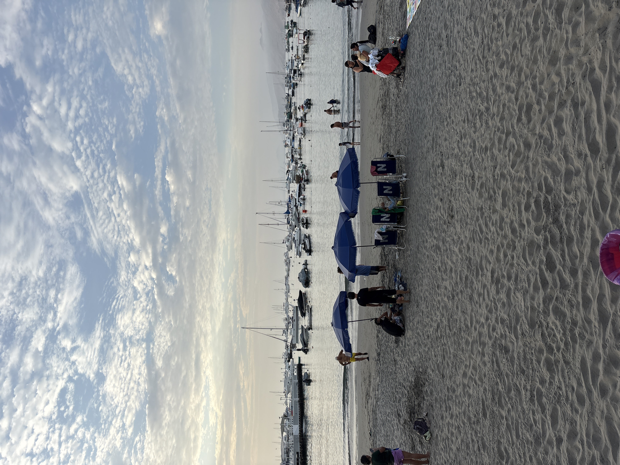 The image depicts a crowded beach and bay area in Ancón, Peru, under a cloudy sky. The foreground shows a sandy beach with ripples and footprints, and a pink plastic bucket is visible in the bottom center. In the mid-ground, numerous individuals and small groups are present on the beach and in the shallow water. To the far left, a person wearing a dark top and purple shorts stands facing the water. Towards the center-left, a man in yellow swim trunks is emerging from the water. Further right, three blue beach umbrellas are set up, casting small shadows. Under two of these umbrellas, four blue folding chairs, each marked with a white 'N' logo, are arranged. Several individuals are sitting or standing near these umbrellas and chairs; one person is seated under an umbrella with a dark shirt, and another person in a dark shirt and shorts stands nearby. Further right, a group includes a woman holding a baby, another person standing next to them, and various personal items such as bags, towels, and a colorful mat spread on the sand. Several people are wading or swimming in the calm bay water, including individuals farther out near the boats. The background features a bay filled with a high density of boats. These include numerous sailboats with masts, motorboats, jet skis, and smaller dinghies, all anchored or moored. To the far left, a long pier or dock structure extends into the water, with additional boats docked alongside it. Distant hills or mountains are visible on the horizon, partially obscured by haze or atmospheric conditions. The sky is largely overcast with multiple layers of altocumulus and cirrocumulus clouds, allowing some patches of clear blue sky to be visible, indicating diffused natural light.