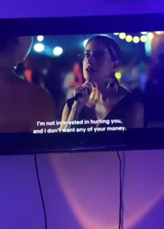 A TV displays a scene from a movie or television show. A woman with dark hair, dark eyes, and red lipstick is speaking to someone out of frame. She is wearing a black dress and large, round earrings. The text on the screen reads: "I'm not interested in hurting you, and I don't want any of your money." The background is blurry but appears to be an outdoor gathering with lights. The TV is mounted on a wall painted white, with a purple light shining from the bottom. There are two black wires hanging beneath the TV.