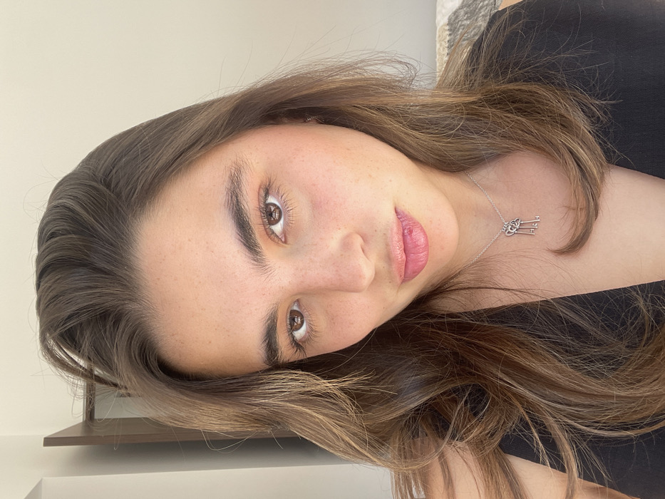 The image displays a close-up portrait of a young adult female, looking directly at the camera. She possesses a fair complexion with visible freckles, dark brown eyes, and full dark brown eyebrows. Her lips are full, with a small reddish mark present on the center of her upper lip. Her long, dark brown hair, styled with a slight left part, cascades over her shoulders. She is dressed in a black v-neck top, revealing a silver necklace with a pendant depicting a cluster of three stylized keys and a heart. The background is blurred, showing a light-colored interior wall or surface, with a dark brown vertical element partially visible on the far left and a textured, light-toned object faintly discernible on the far right. The scene is illuminated by natural light, indicating an indoor setting. The specific location within Zibatá, Mexico, cannot be determined from the visual information provided.