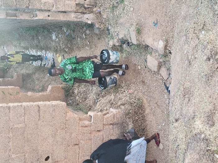 A man in a green shirt carries two buckets suspended from a stick across his shoulders. Another person in a yellow shirt walks behind him. A building with tan brick walls is on the left. Another person wearing a dark shirt and a white skirt is in the lower-right corner. The ground is mostly bare with patches of dry grass. Some trash is scattered around.