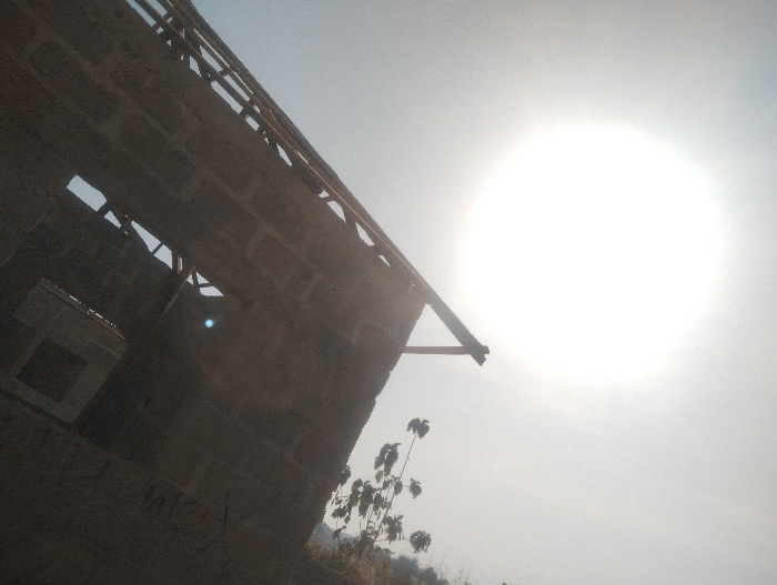 The scene is located in Unguwan Rimi, Nigeria. An unfinished single-story building, constructed of dark-toned cinder blocks, occupies the left half of the frame, viewed from a low angle. The structure exhibits rectangular window openings and an incomplete wooden roof truss system. The sun, a brilliant white orb, dominates the upper right quadrant against a light grey sky, casting the building into partial silhouette. Minimal dark-leafed vegetation is present in the lower right. No individuals or discernible activities are depicted.